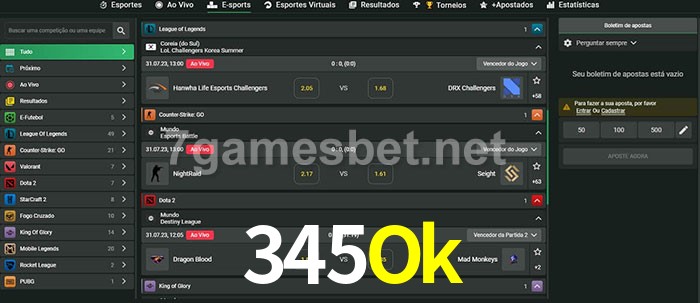 O 345Ok oferece uma grande seleção de opções de apostas em e-sports com probabilidades competitivas